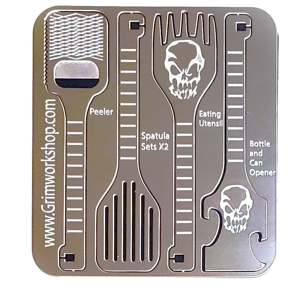Grim’s camping cooking gear is all reusable thanks to our custom fabricated Tool Retention System. This unique feature allows you to remove any item from your Eat’n Card, use it, and then return your items back to the card base’ to use again another day. Grim's tool retention system is nonmagnetic and non adhesive (so no gunk build-up on your gear). Find out More about our TOOL RETENTION SYSTEM HERE