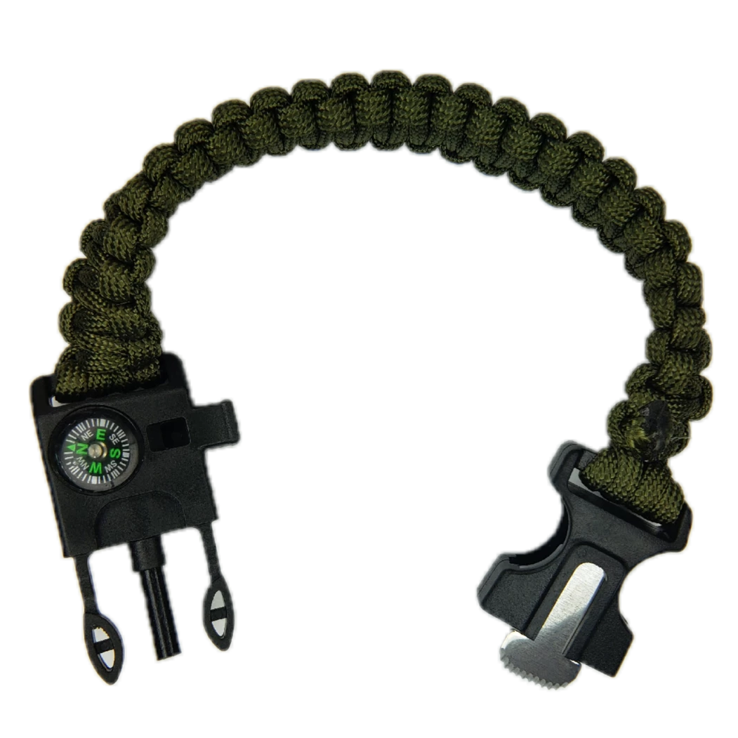 A: This bracelet is equipped with an emergency whistle, a small scraper blade, a ferrocerium rod for fire starting, a compass, and approximately 15 feet of durable paracord.
