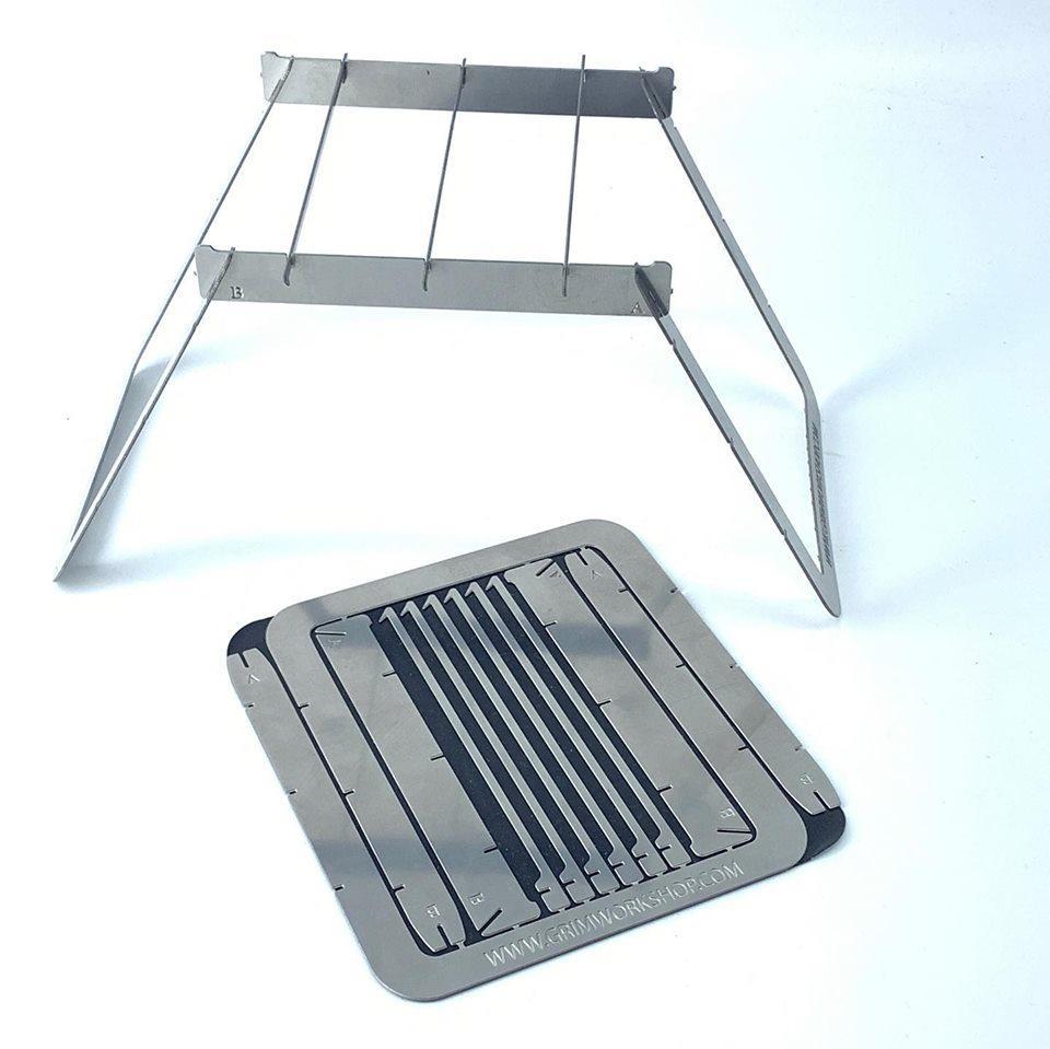 2. Bear Bones Stove: A stove/pot stand you can use with twigs, on an alcohol burner, and other heat sources. The “Bear Bones Stove” can function as a grill, a stove, and comes with a half dozen skewers for cooking vegetables and meats while you use the top side for other cooking necessities and disassembles to fit back on its' storage card that is the same size as a Bear Bowl base plate.