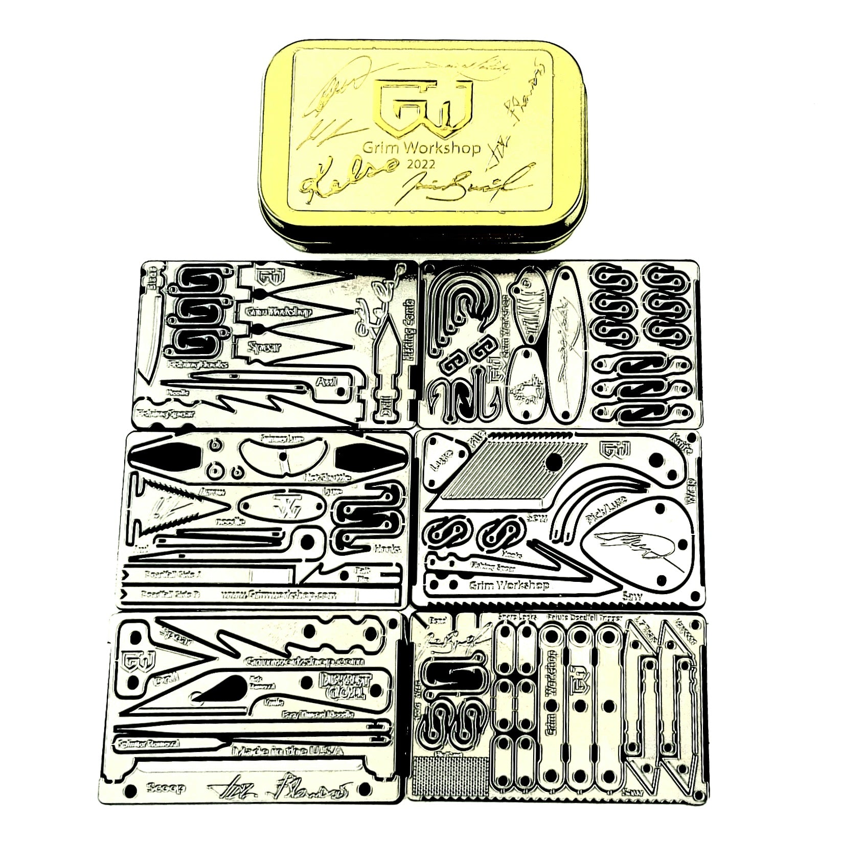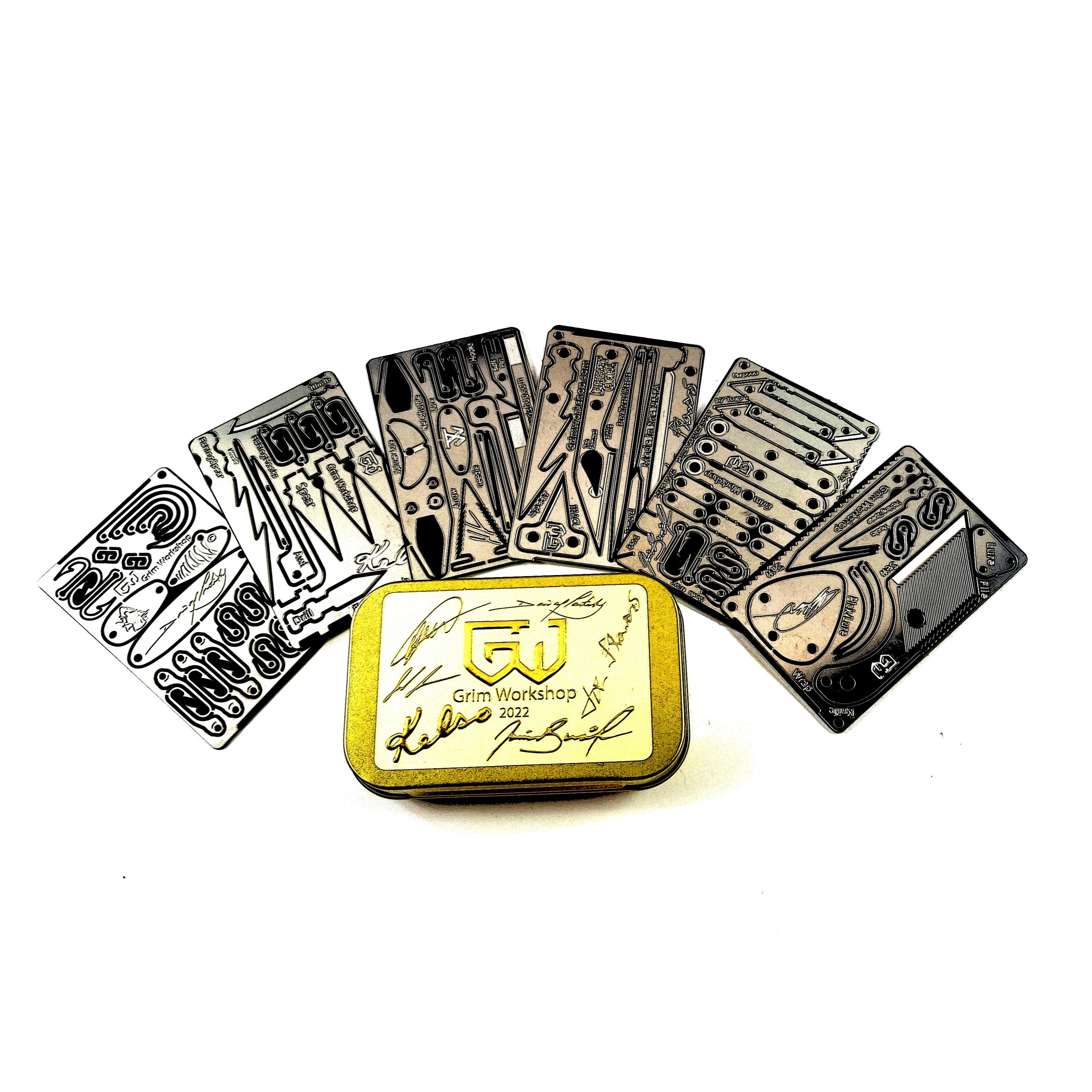This bundled set contains all of our newest signature wallet multi tool cards created in the year of 2021, at a special reduced price, and includes a commemorative tin with all 6 new multi tool cards (over 100 tools) all bundled together as a 2022 bundle with all the new signatures on it, and a set of all four of Grim's sharpener cards! Altogether these people have over a century of combined experience in the bush, and have some of the most comprehensive survival knowledge there is. These multi tool cards together put hundreds of tools right there in your pocket, specially designed and curated by master survivalists, and masters of the outdoors.