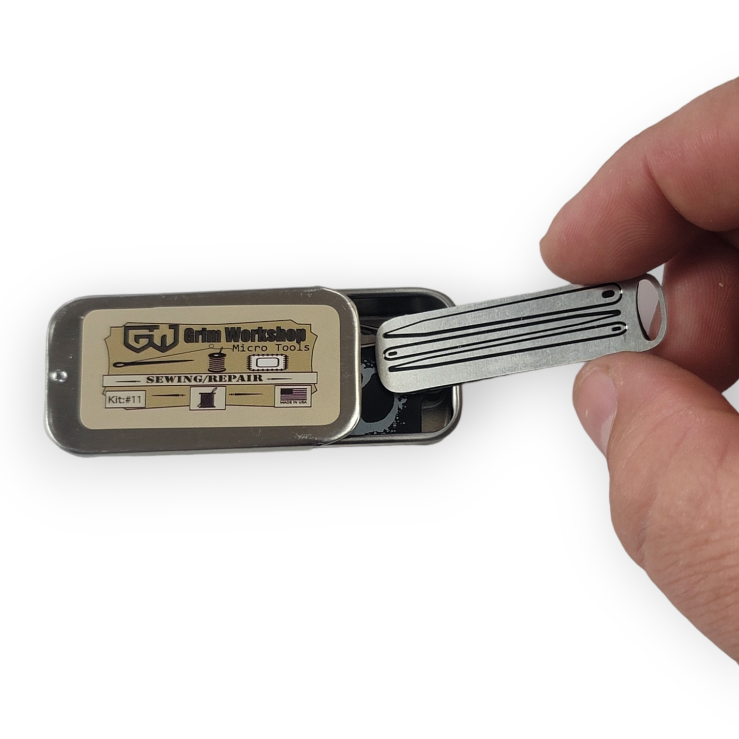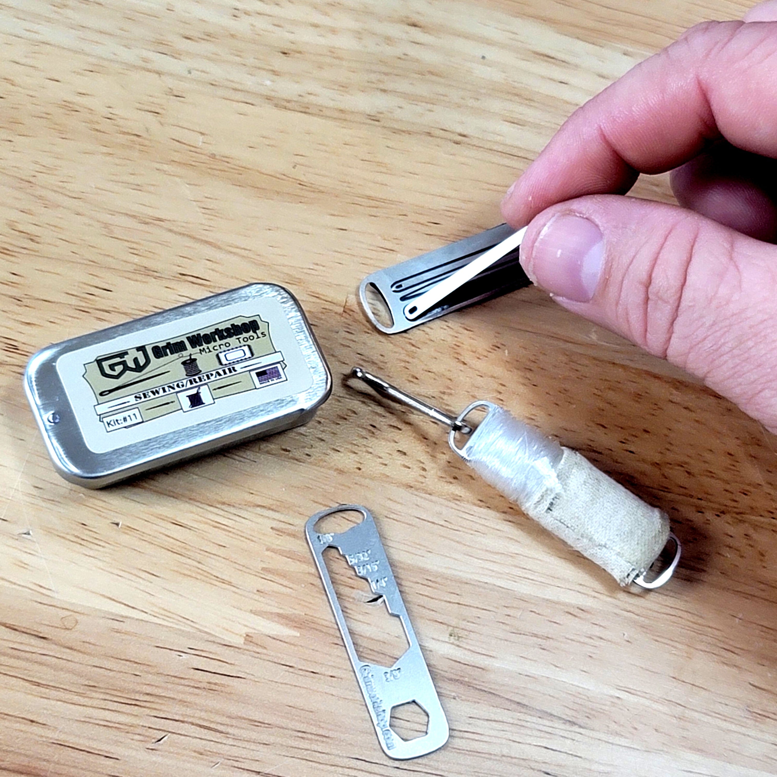 Our mini sewing kit contains three of our different micro size repair, and sewing tools, as well as a silencer sleeve, small tin with identification, and a micro sized clip for all three tools that allows for keychain carry. This mini sew kit includes three tools perfect for a mini sew kit for travel, repair kits, and more.