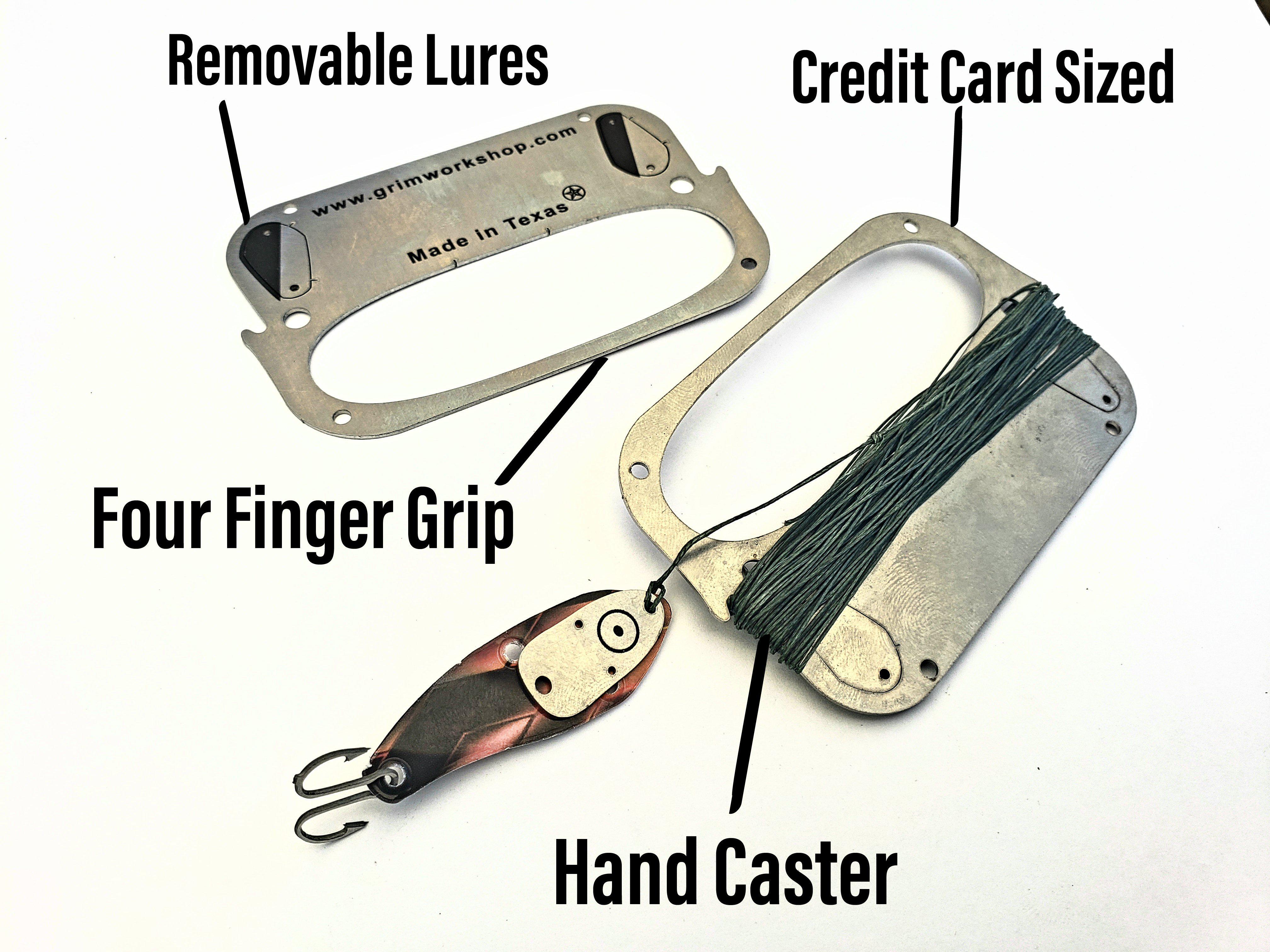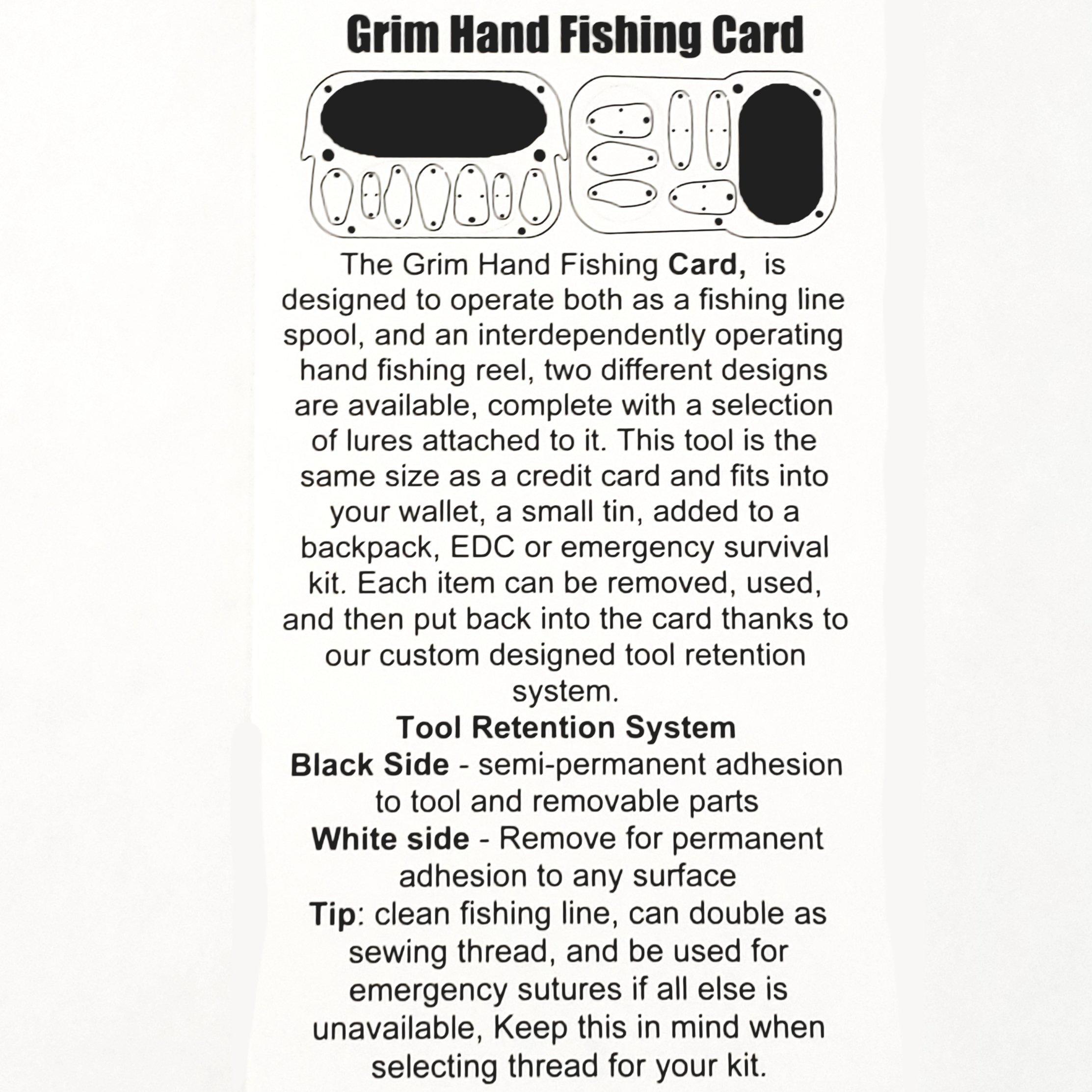 Grim's Card Caste Handline Reel (line not included) was designed to work like any other fishing handline reel, it spools line in massive amounts to be ready for you to fish with. The hand caster fishing card is an ultra compact, hand held fishing line spool, and hand caster, complete with integrated lures, a fully functional fishing handline reel. This card caster works with any type of fishing line, but can also be used to hold other materials like wire, tape, kevlar, thread, and more. The fishing handline reel is the same size as a standard credit card, so it fits conveniently inside a standard "mint" tin, and can even fit inside a wallet if you don't put much more than a few dozen yards of line on it at once. The Grim fishing handline reel, is one of the best travel fishing kit additions for ultra lite hiking, and camping, as well as allowing the accessibility of a full hand casting kit in a small card sized fishing kit.