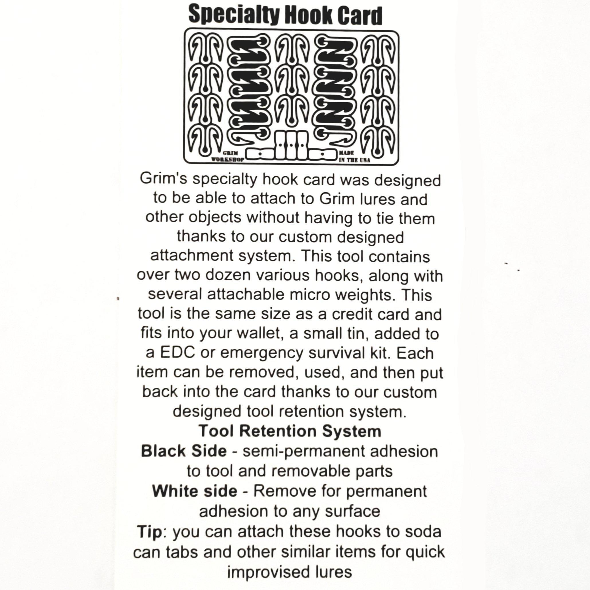 Grim's Specialty Hook Card, is a credit card sized pocket fishing kit, with a plethora of different hooks. Though they can be used as-is, they were specially designed to fit onto our lure card lures hassle-free with no knots needed due to our in-house designed hook attachment system utilized on this fishing survival card. This card comes with not only dozens of hooks but also several micro weights/lures to help weight down your hooks and add some flash and additional movement to them.