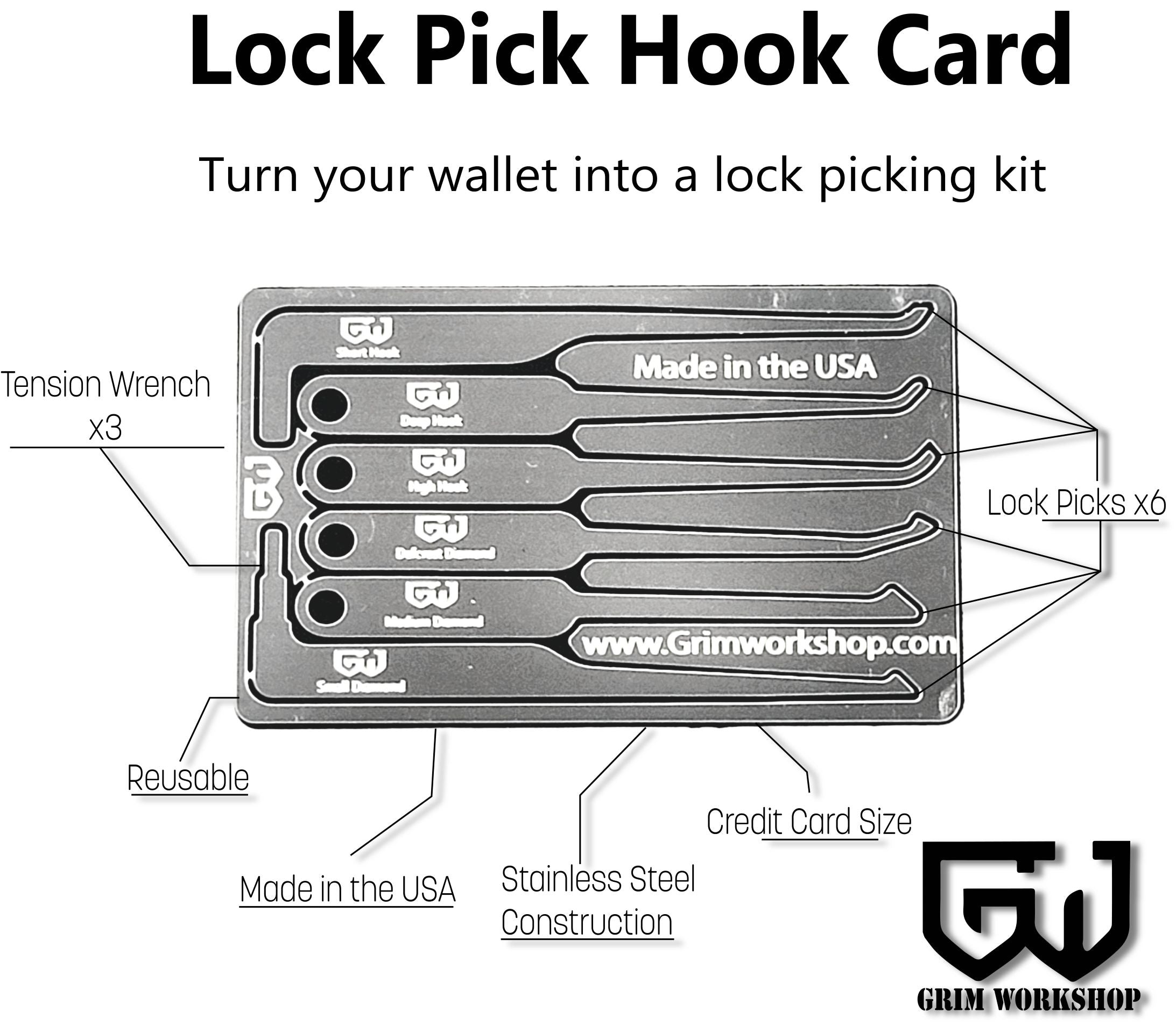 - Durable Construction – 0.025" thin steel on the Lock Pick Hook Card, tough and durable, this wallet lock pick set is ready for a lifetime of use!