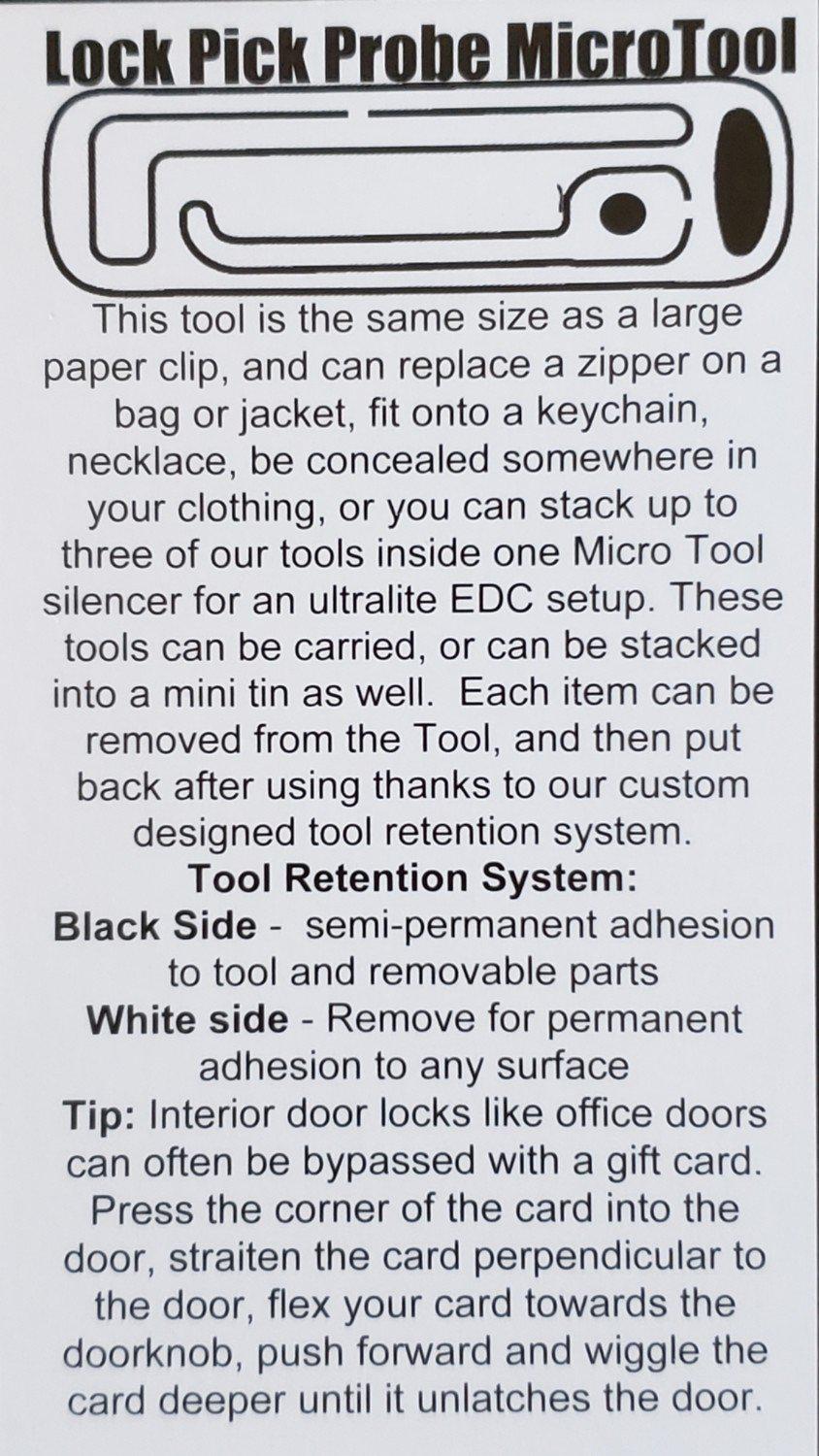 The Lock Pick Probe Micro Tool is designed to be stackable, allowing you to store multiple tools efficiently in an Altoids tin or similar container. This feature is perfect for those who want to build a comprehensive and compact EDC kit.