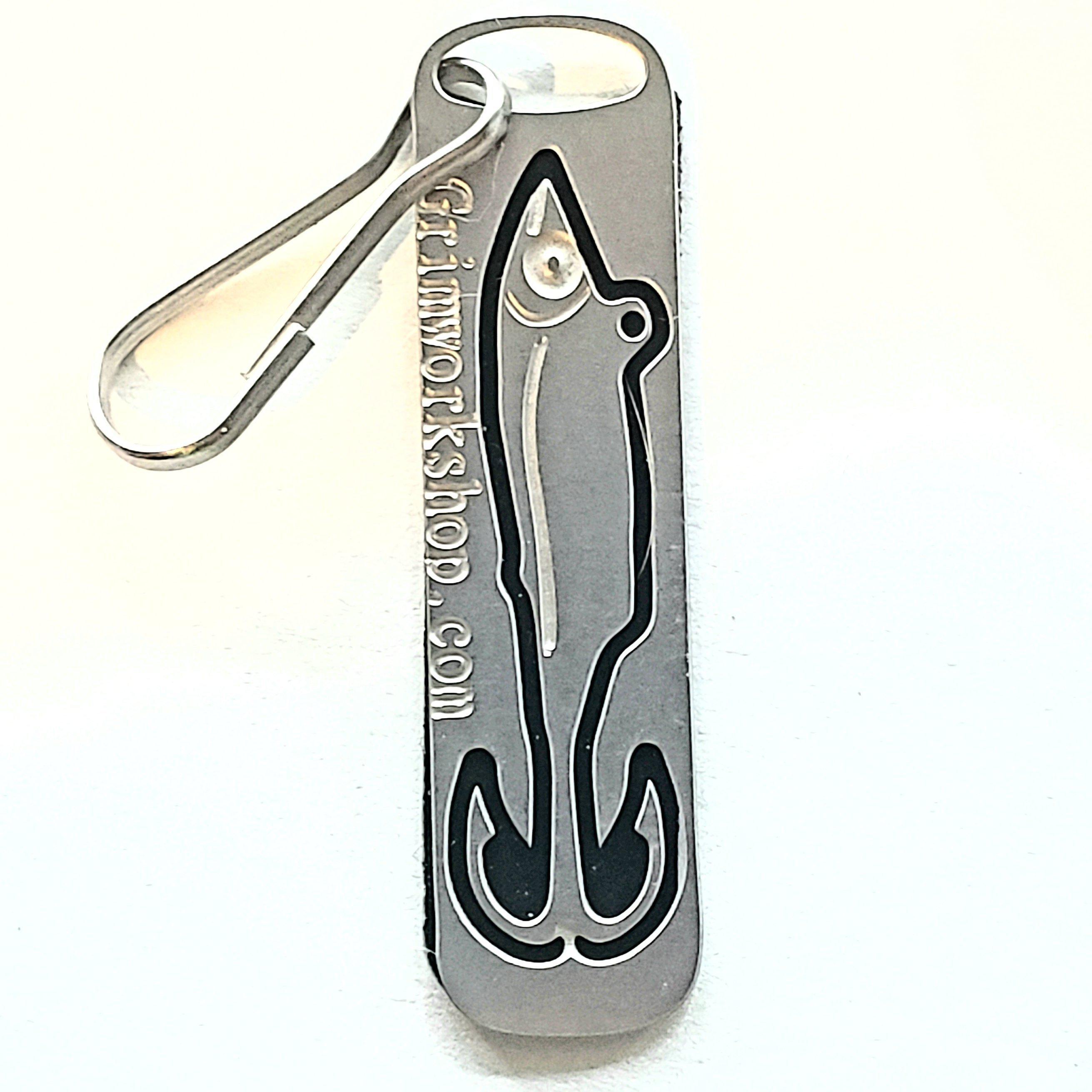 Grim's minnow micro fishing lure tool is about the size of a large paperclip, with a small removable stainless steel lure that can be returned back into its base when you're finished using It. This micro sized minnow lure is perfect for a miniature survival fishing gear. Grim Workshop’s Micro Tools are sized to fit onto a key ring or zipper pulls. These ultralight tool kits are just 2” long and 0.5” wide, about the size of a large paper clip which is what makes them fantastic additions to a custom fishing lure keychain, zipper pulls, or even on a small fishing necklace.