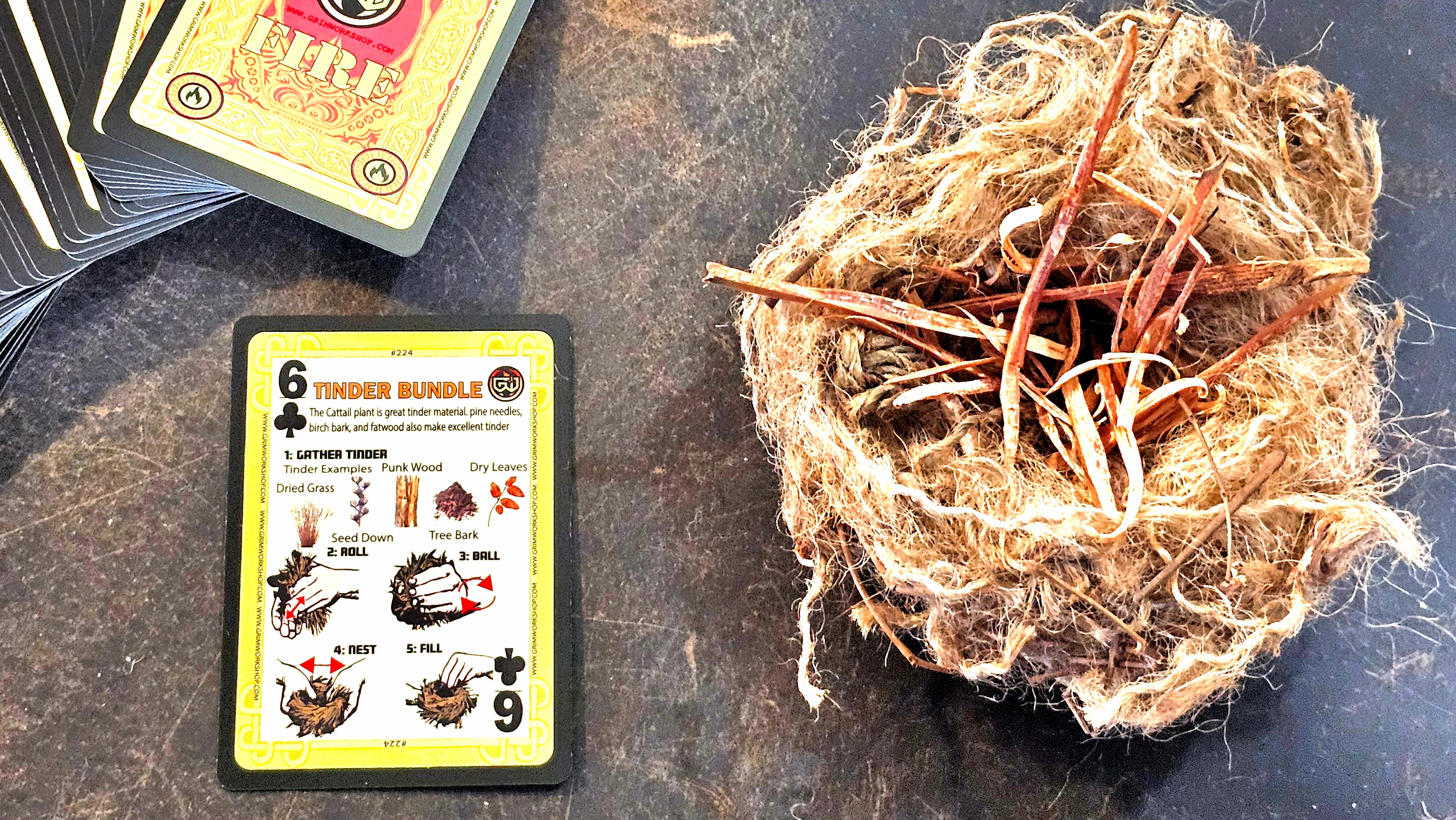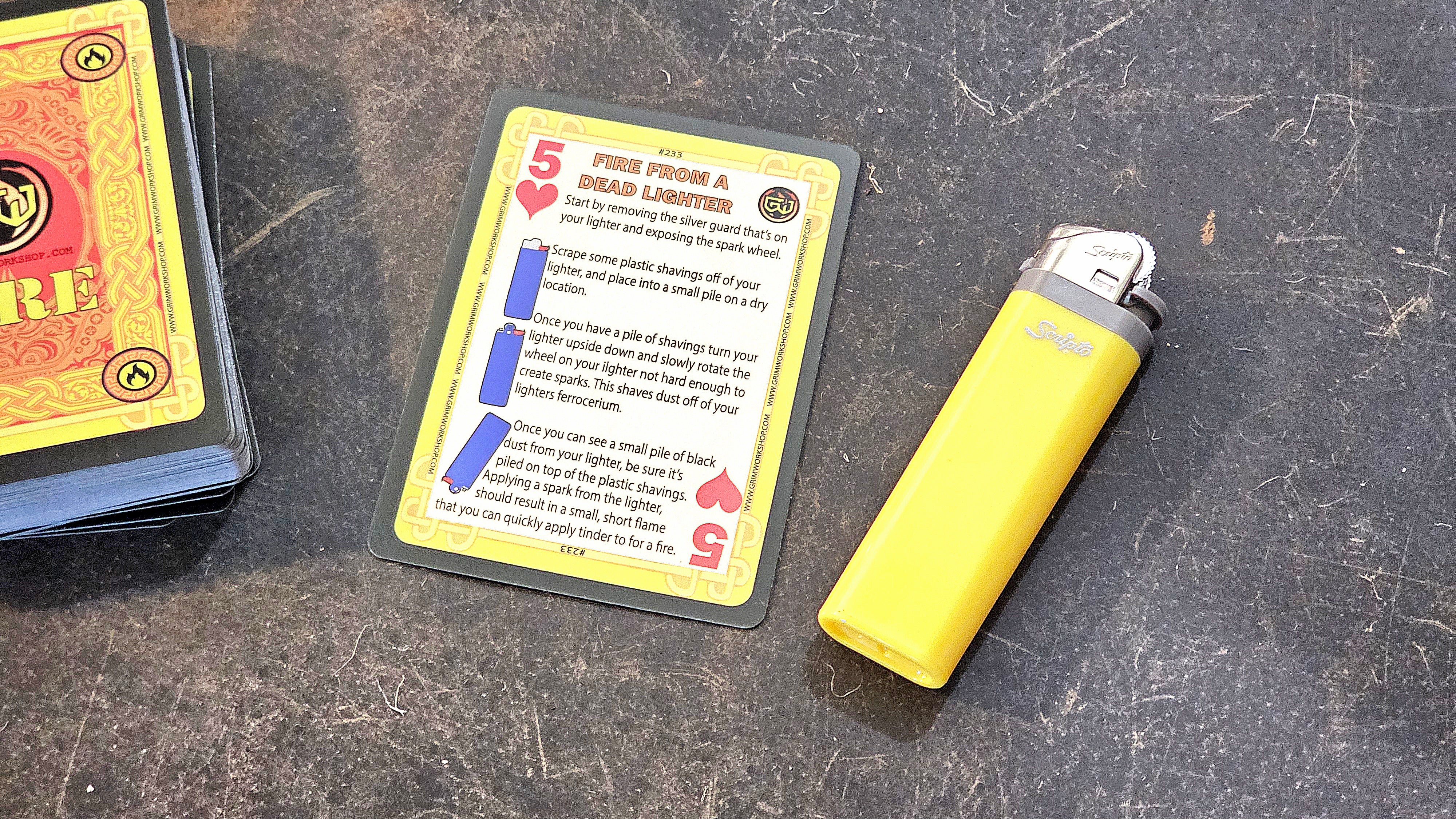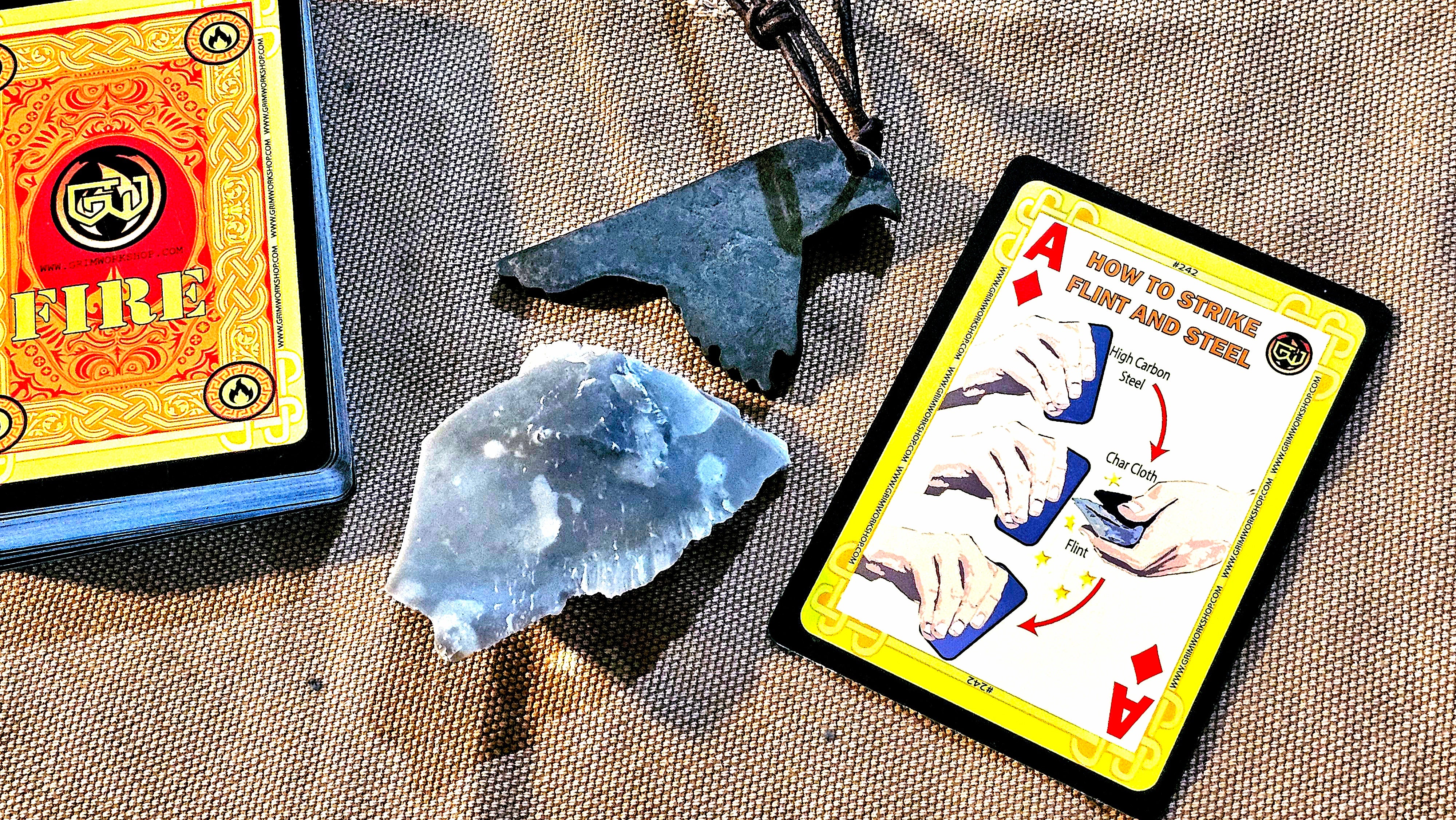 Learn the essential skill of fire starting. This deck includes many different types of fire's, as well as various methods for starting a fire, ensuring you know the best fire to choose, whether your trying to keep warm, or cook a meal. Techniques for striking a flint and steel, properly using a ferrocerium rod, and even how to make your own friction fire are also covered, as well as many non-traditional fire starting techniques ensuring you are ready to start a fire in any situation, rain or shine.