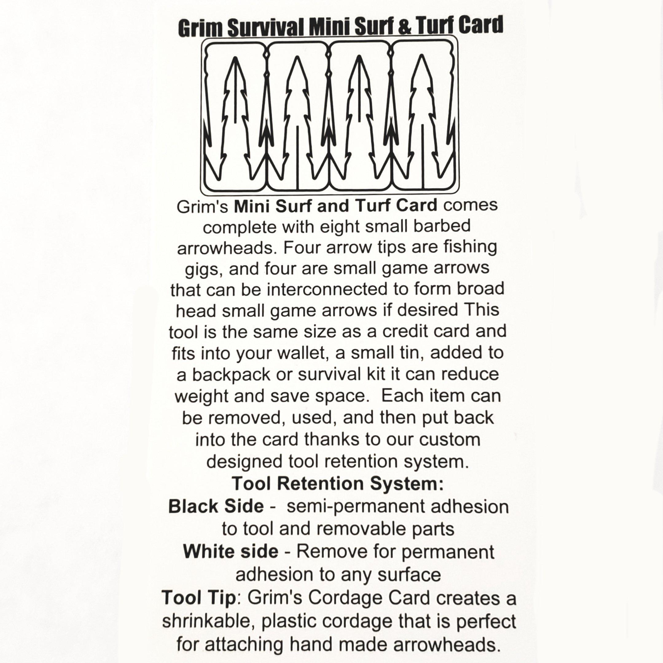 How to make small game arrows, or bow fishing arrows is not a problem thanks to Grim’s Surf and Turf survival arrowhead card, which is an excellent addition to any EDC, survival, or emergency kit, or a great addition to any hunters' toolbox. With a combination of 8 different arrowheads, 4 points for bow fishing arrows, and 4 for small game arrows which are interlocking tools that can be combined into two broadhead small game arrows, the fishing and small game arrows on the surf and turf arrow card are an awesome way to store a lot within a very small space. These even work as small spear heads for fishing and hunting small game. Never worry about how to make an arrow in the forest, with the Surf and Turf card in your pocket you’re ready.