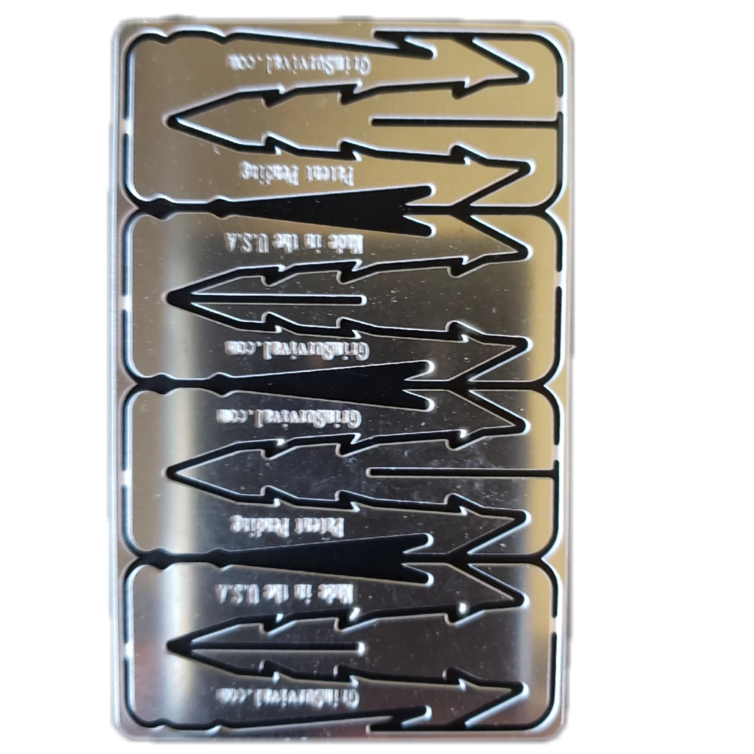 Grim Survival Cards are all reusable thanks to our custom fabricated Tool Retention System. This unique feature means you never have to worry about how to make an arow head, just remove any arrowhead from your card, use it, and then return survival arrows back to the gear keeper card to use again another day. Grim's tool retention system is nonmagnetic (so no de-magnetized credit cards) and non-adhesive (so no gunk build-up on your gear or wallet). Find out More about our TOOL RETENTION SYSTEM HERE