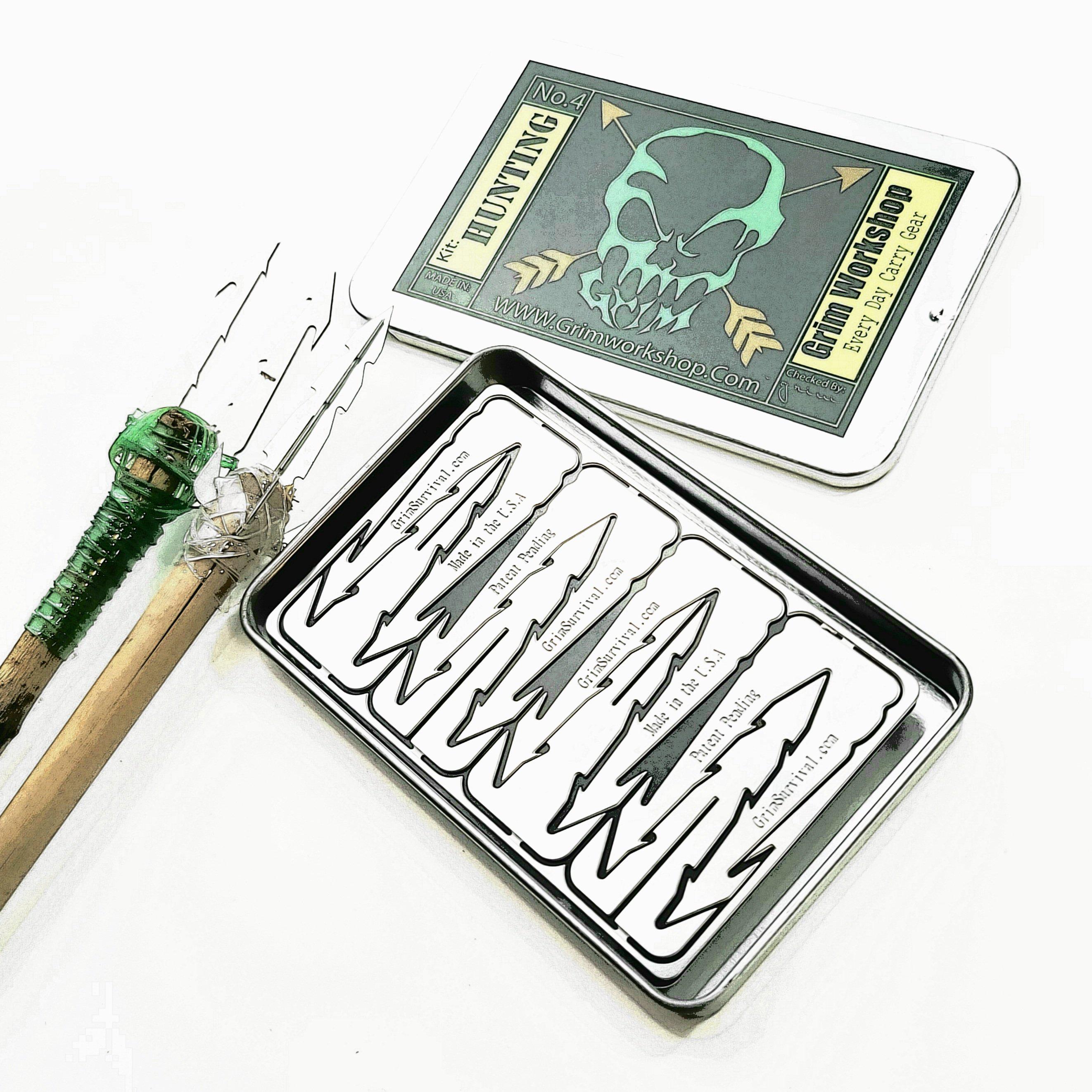 Grim Survival Cards weigh less than an ounce, yet contain essential items to arrow making, the arrow point. Just find a suitable piece of wood, and fletching, the hard part is already done.  only weighing slightly more than a standard credit card, and are only about 1mm thick, this Survival Card can literally remove pounds of weight from your gear, maximize your storage capabilities without losing, and gain additional utility and function in many cases.