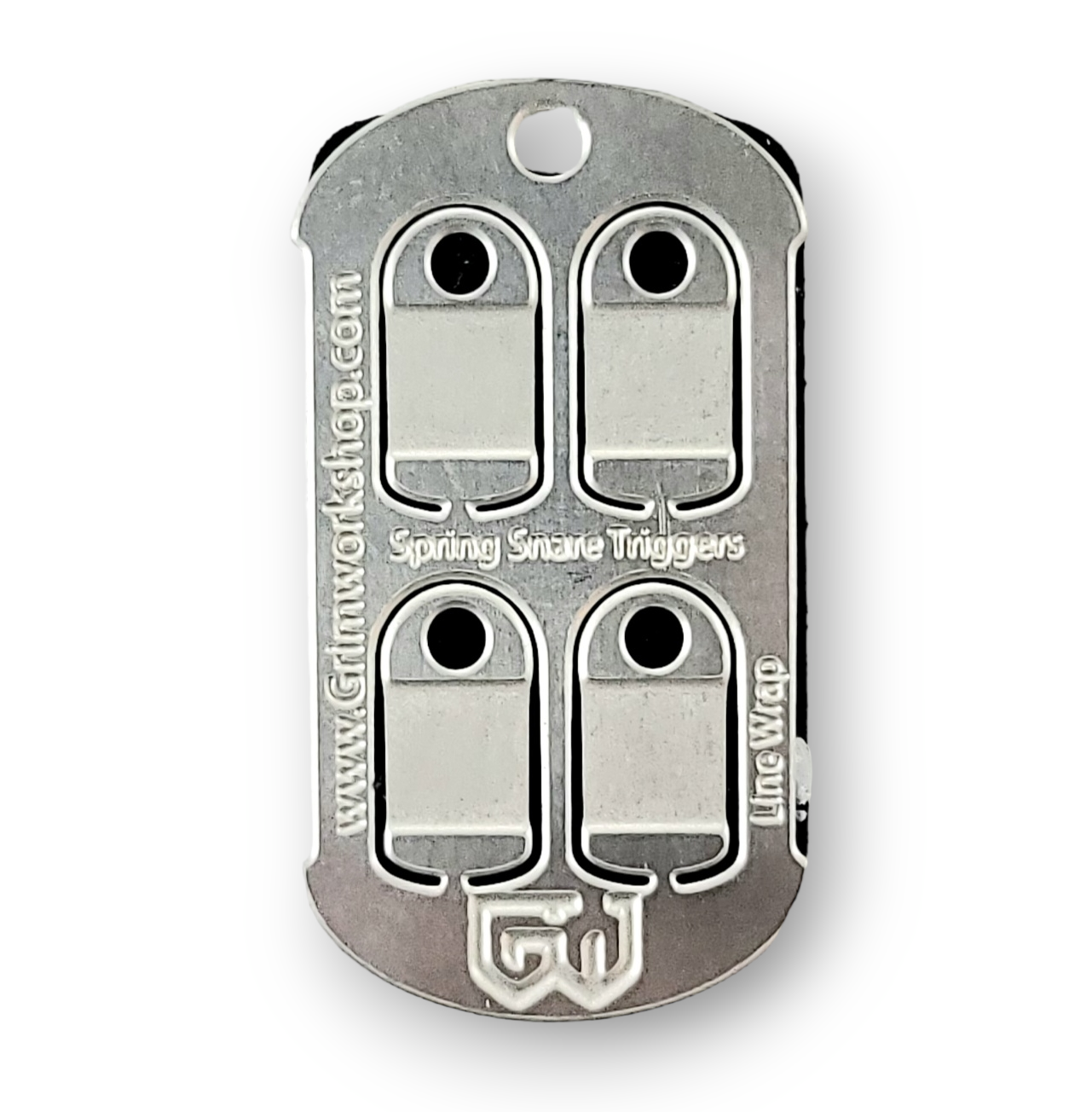 The Spring Snare Trap Dog Tag is part of Grim's trapping tools collection and are two complete spring snare trigger systems with L7 trap triggers that can interlock to create a quick, easy spring snare trap setup that can be used for traditional trapping or in a trigger snare fishing.