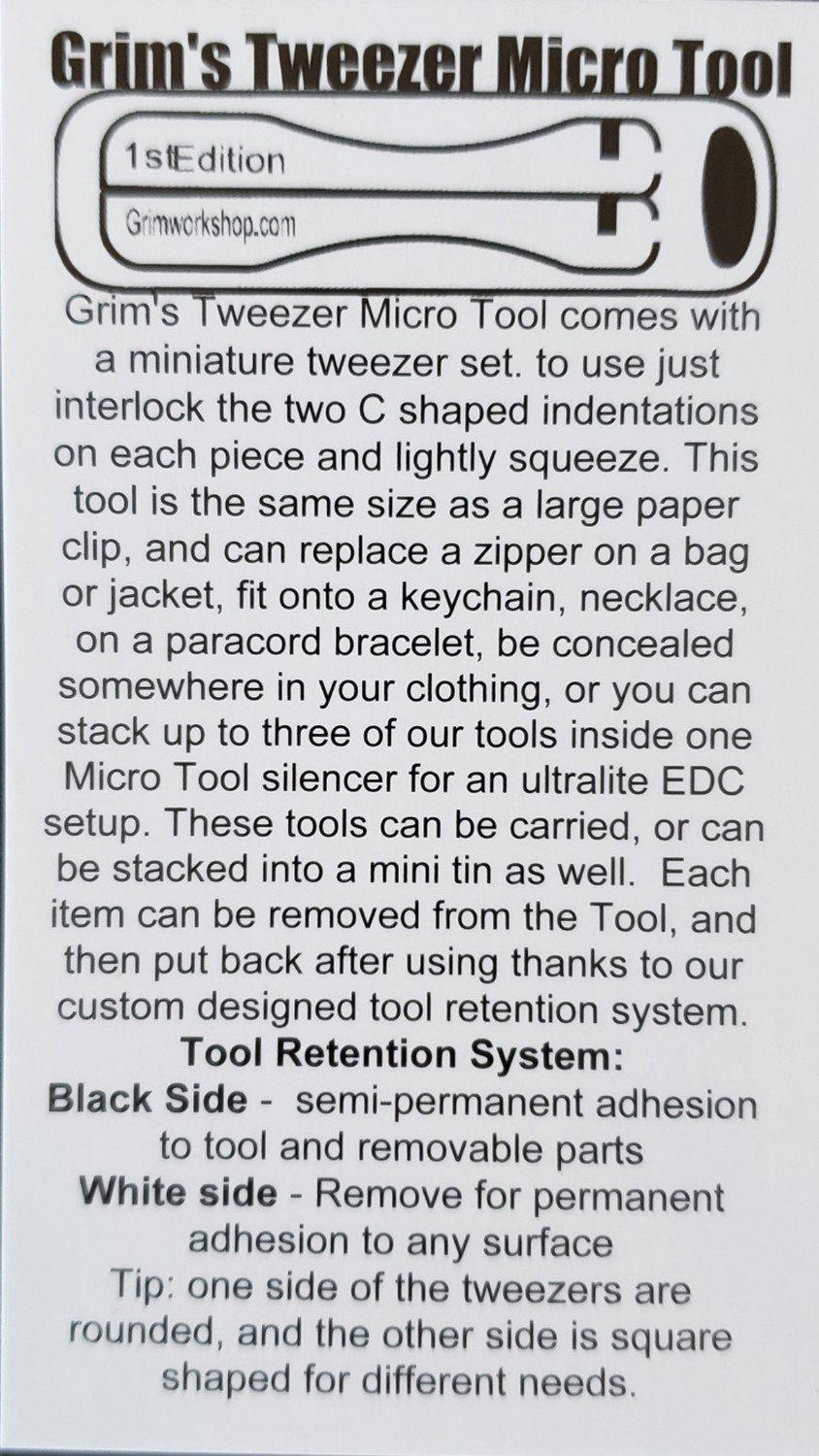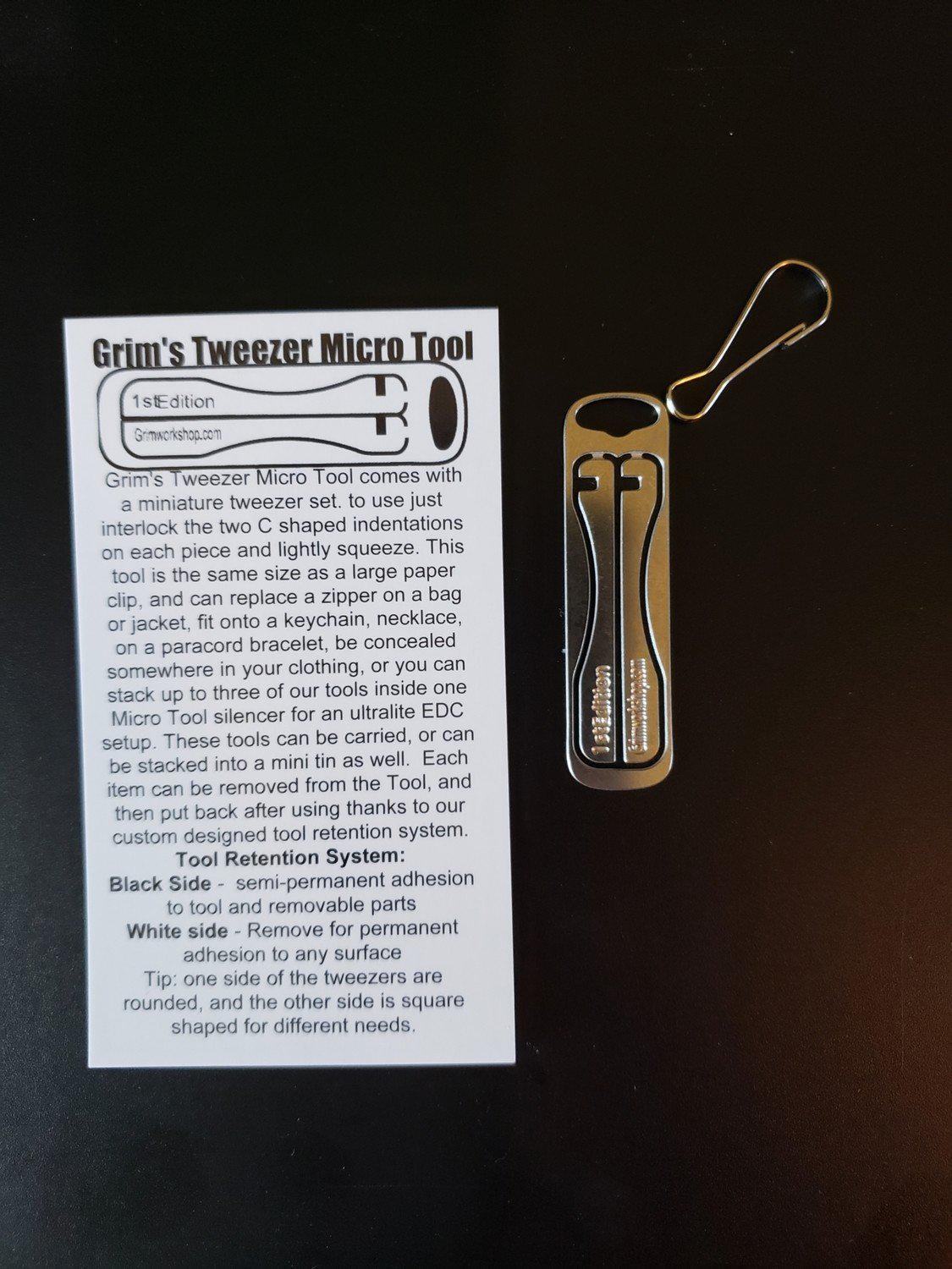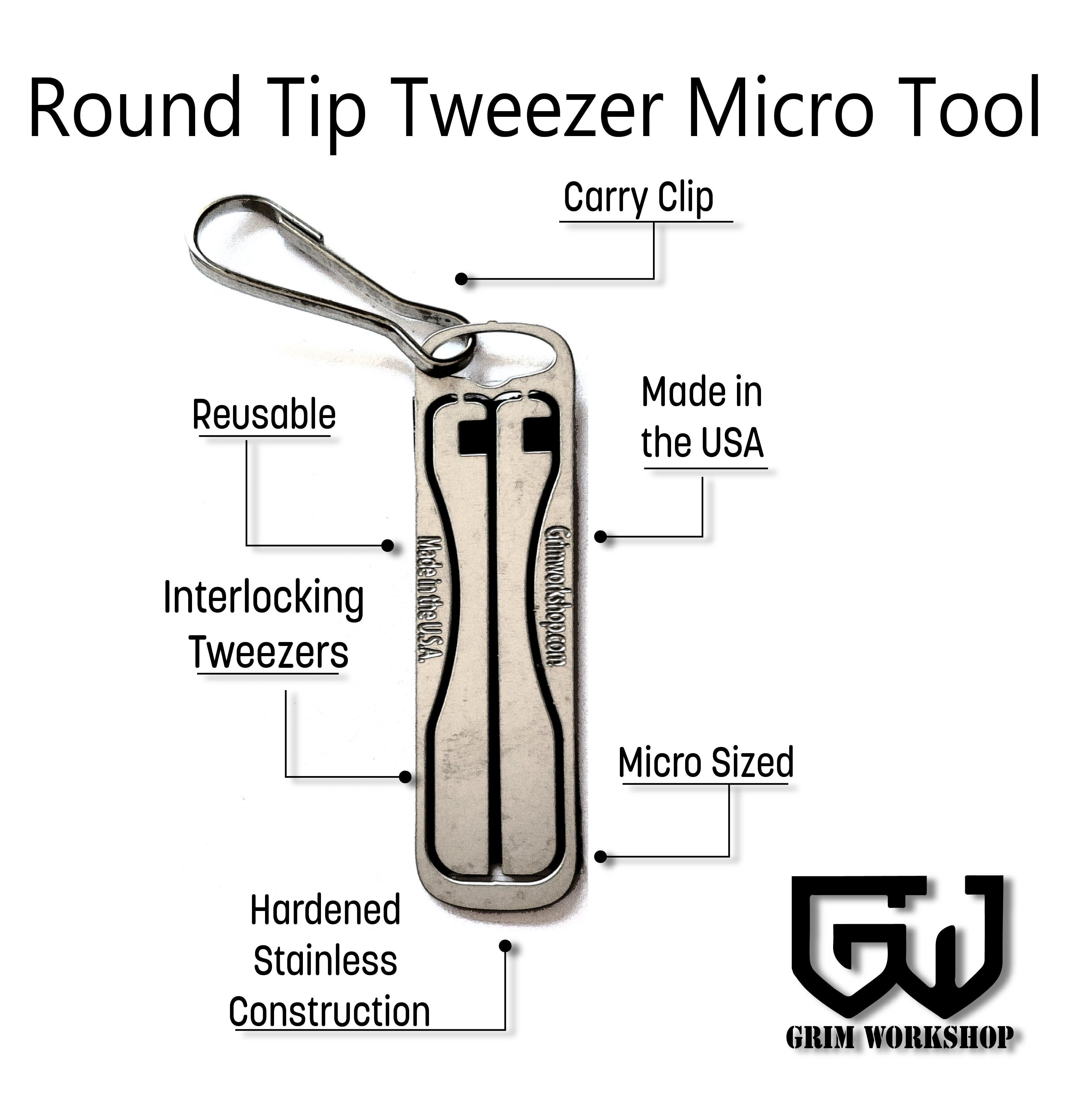 Pack Grim's Micro tools into places no other gear can go. These tools were created to be easily accessible, but also our most easily concealed tools with the smallest footprint we could manage. At the same size as a large paperclip, these tools can replace zippers, sit under bracelet bands, go on keychains, necklaces, and dozens of other places. You can stack up to three of our micro tools together in one of our micro tool silencers forming a micro sized emergency, survival, or general tool kit. Our Rounded Tip Tweezer Micro Tool is an ultralight Rounded Tip Tweezer is just under 2" long and 0.5" wide, about the same size as a large paper clip. Perfect for a keychain, backpack zipper, or even a small necklace.