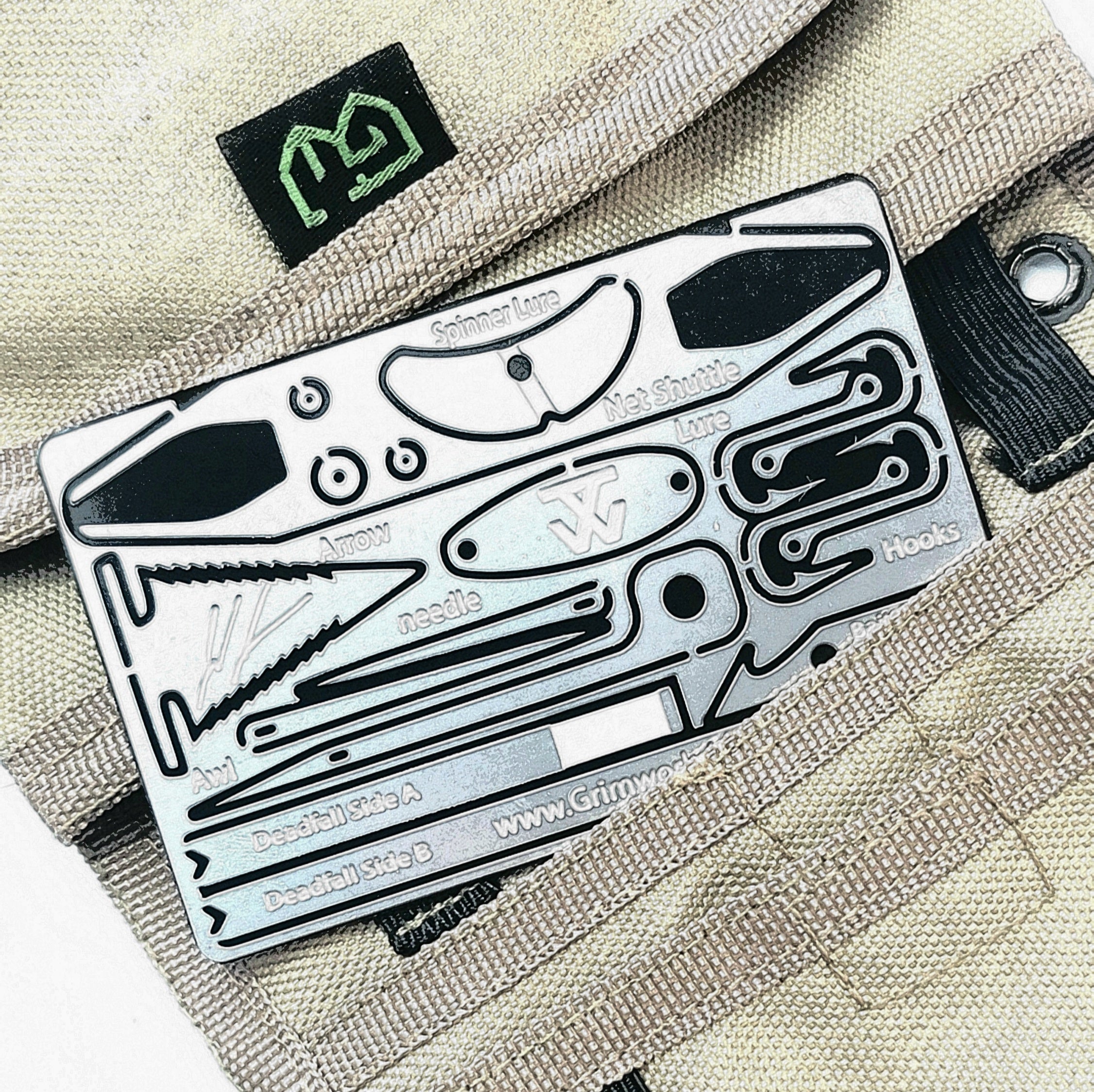 Grim stainless steel survival cards are all reusable thanks to our custom-fabricated Tool Retention System. This unique feature allows you to remove any item from your card, use it, and then return it back to the card to use again another day. Grim's tool retention system is nonmagnetic (so no de-magnetized credit cards) and non-adhesive (so no gunk builds up on your gear or wallet). Find out more about our TOOL RETENTION SYSTEM HERE