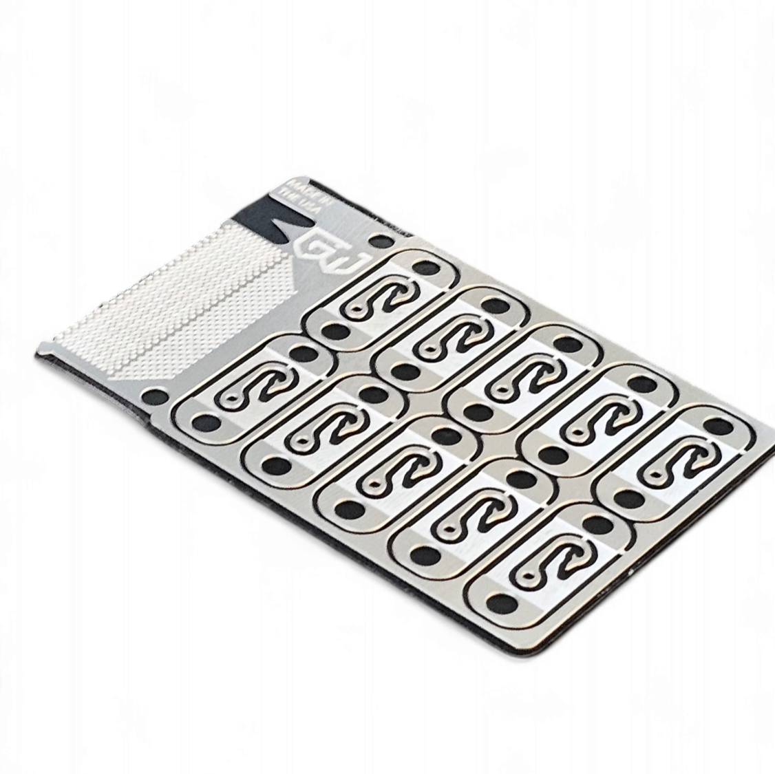 The Spring Snare Fishing Card's five spring snare locking mechanisms are invaluable for setting up land-based traps in survival situations. These mechanisms, which work as pairs, allow you to create effective spring snares for catching small game, providing a reliable source of food in the wild. Additionally, each locking mechanism can be used individually as a fishing lure, giving you the flexibility to adapt to various environments. Whether you're setting up traps to secure protein or using the lures to catch fish, these locking mechanisms offer a versatile and practical solution for outdoor survival.