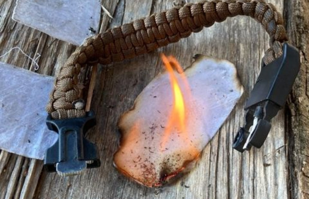 Strike the strands using a ferro rod lighter, or a spark wheel striker to catch the tinder on fire.