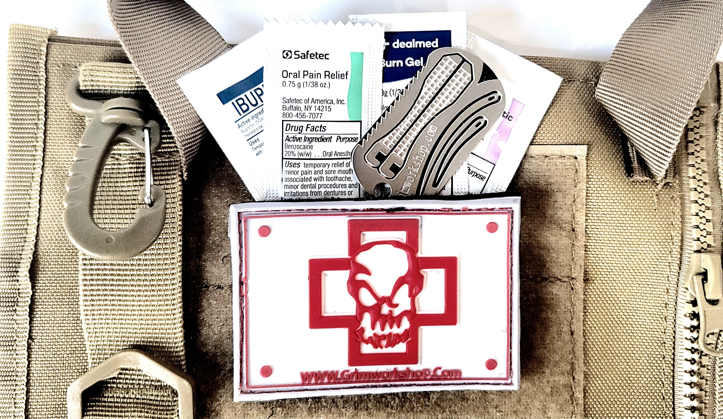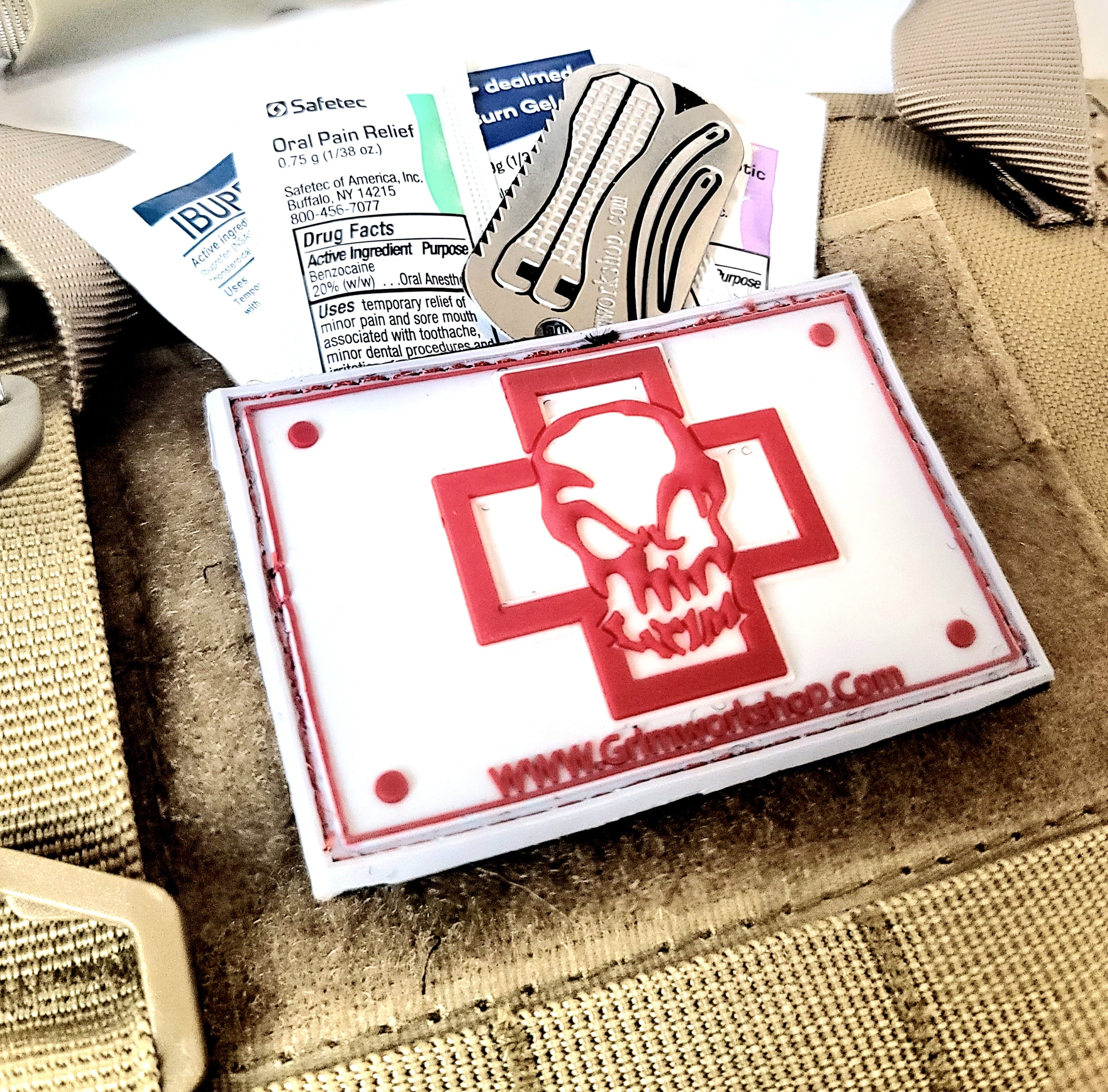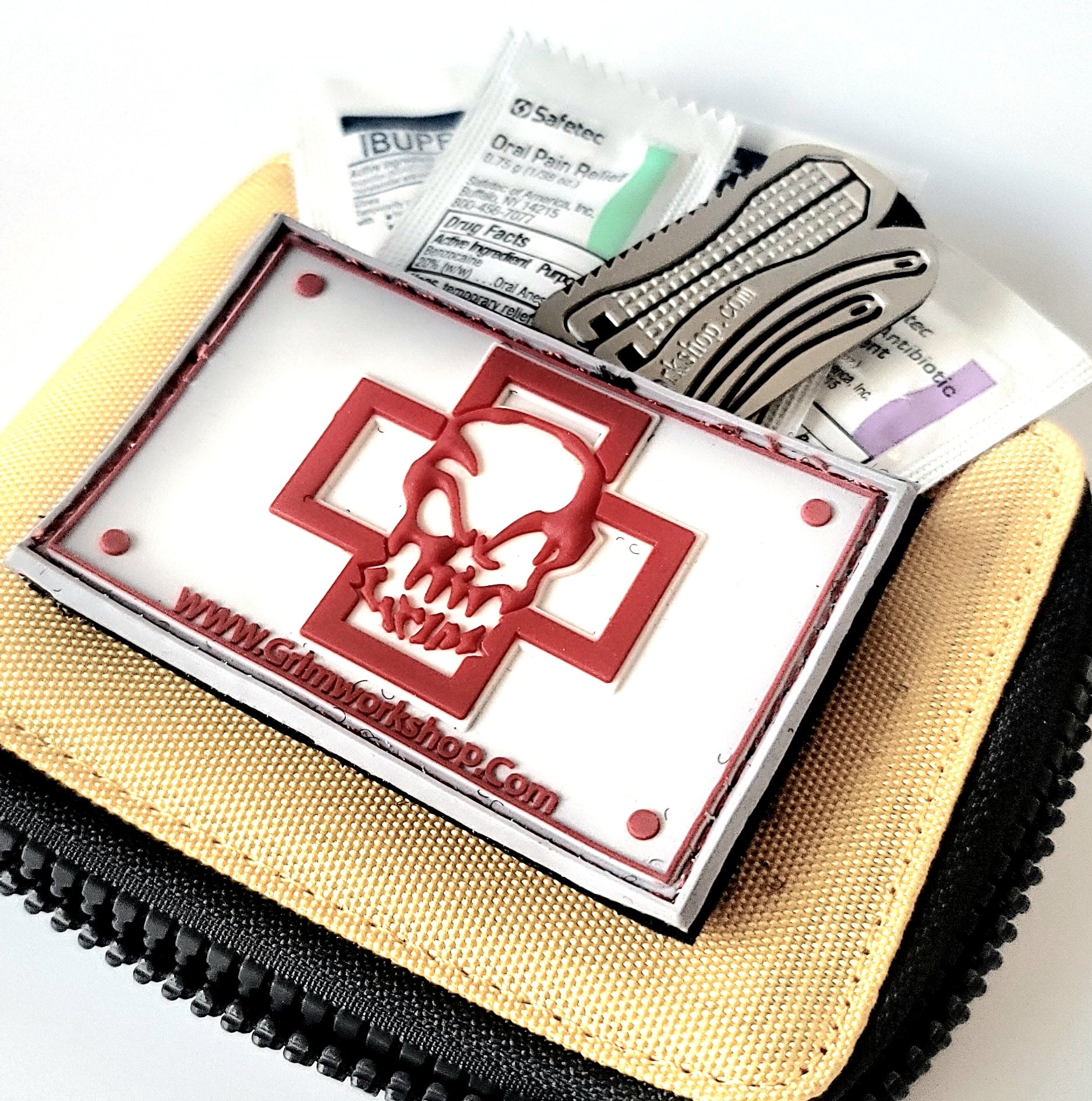 Grim's first aid patch is a pvc Velcro patches that can help identify important pieces of kit. This morale patch is specifically made to hold a small amount of emergency supplies, easily stored onto a backpack, hat, or other object with velcro receptical. This is a great place to store emergency medications and other small emergency items.