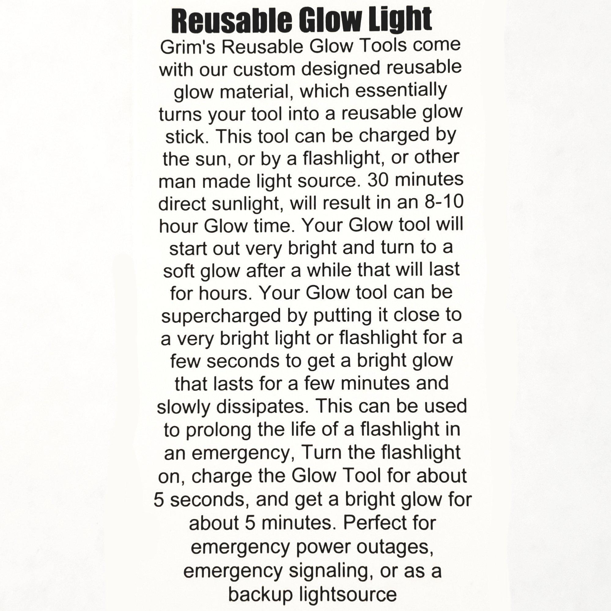 One 30-minute charge by the sun gives this card survival light an 8–10-hour glow time, or you can charge it up for just a few seconds with a flashlight for a bright supercharge and get several minutes' worth of glow time from it, extending the life of your flashlights as well in a pinch. no rechargeable batteries that only work so many times and then quit. ditch the non reusable glow stick that takes up space and can only be used once. Get a Grim rechargeable glow card, and light up the night.